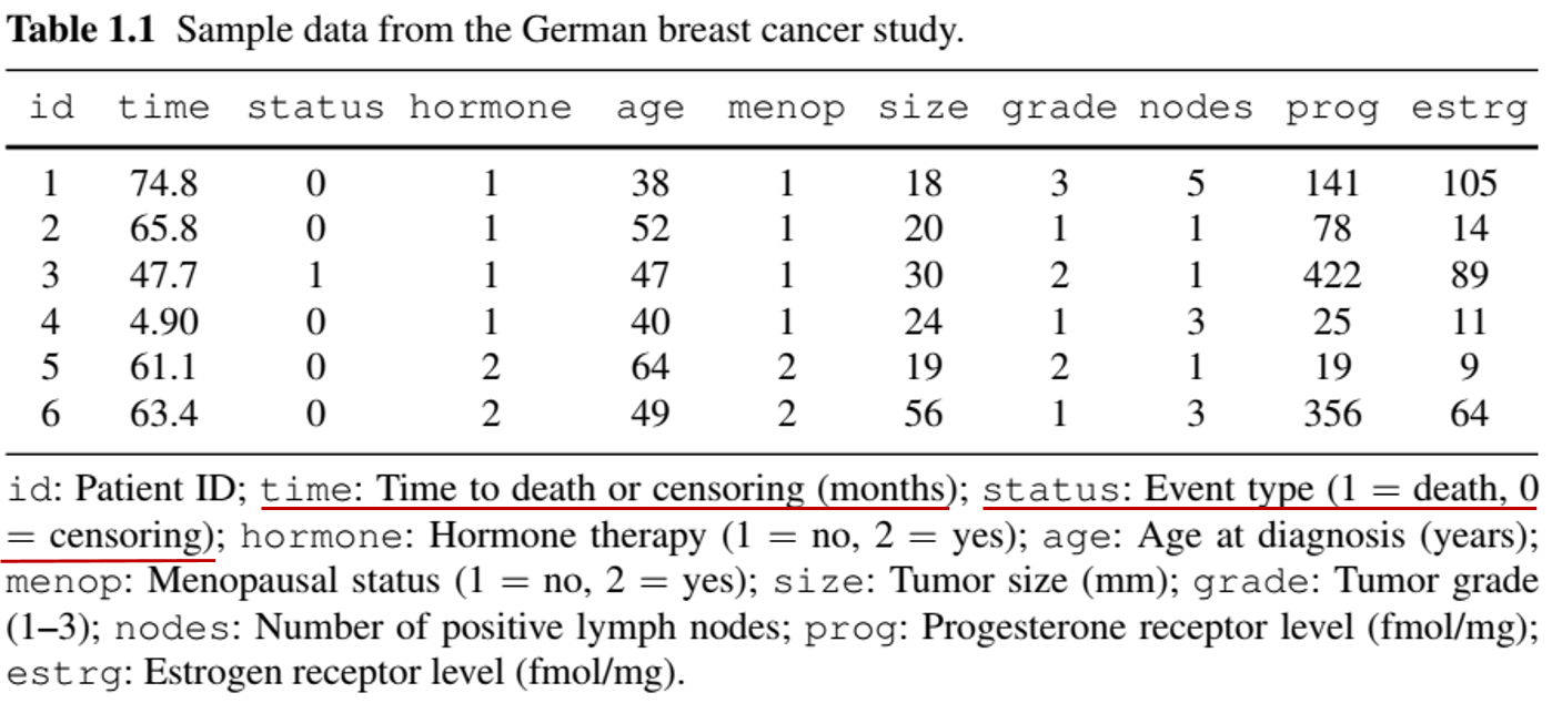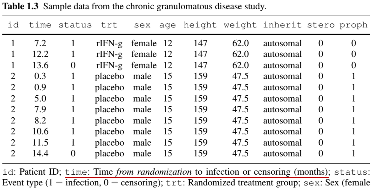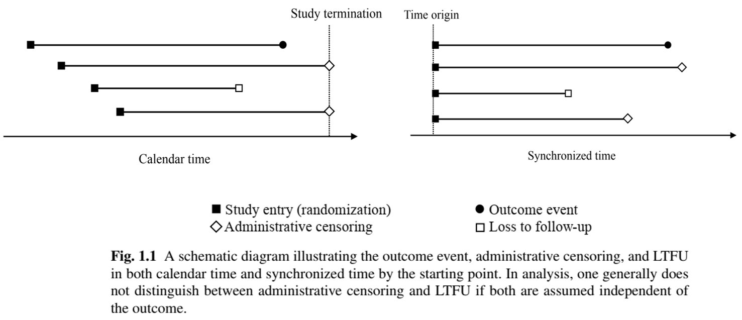Event/censoring time \(=\) time from starting point (e.g., randomization) to event/censoring (as opposed to time on the calendar)