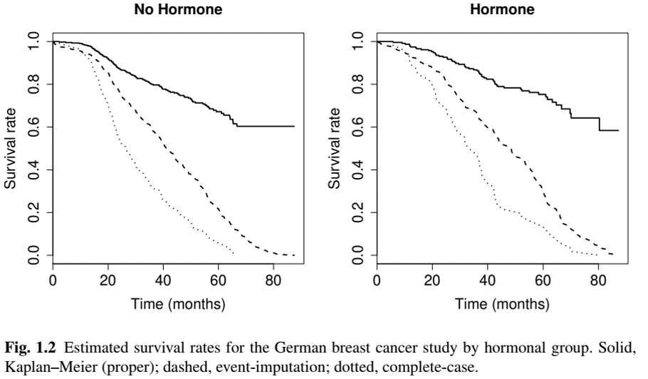 Event-imputation empirical survival function: \[\hat S_{\rm imp}(t)=n^{-1}\sum_{i=1}^n I(X_i > t) \to {\rm pr}(X > t)\leq S(t)\]