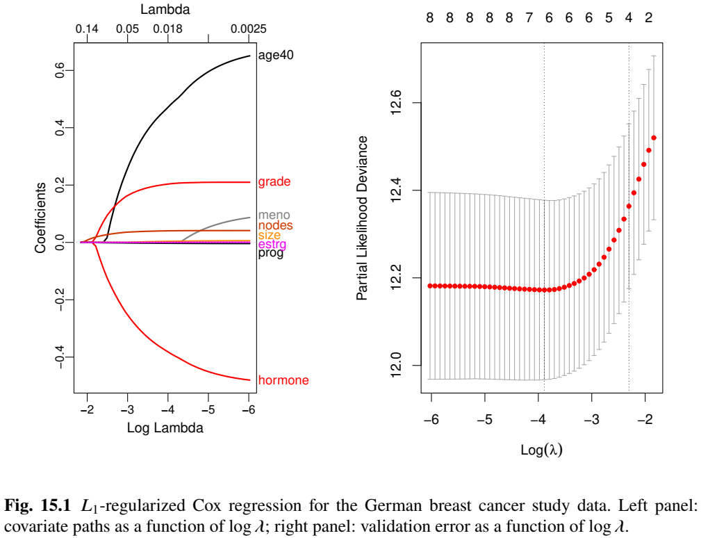 - Regularize by \(L_1\) penalty \[\begin{equation}\label{eq:vs:cox_lasso} Q_n(\beta;\lambda)=-n^{-1}pl_n(\beta)+\lambda\sum_{j=1}^p|\beta_j| \end{equation}\]