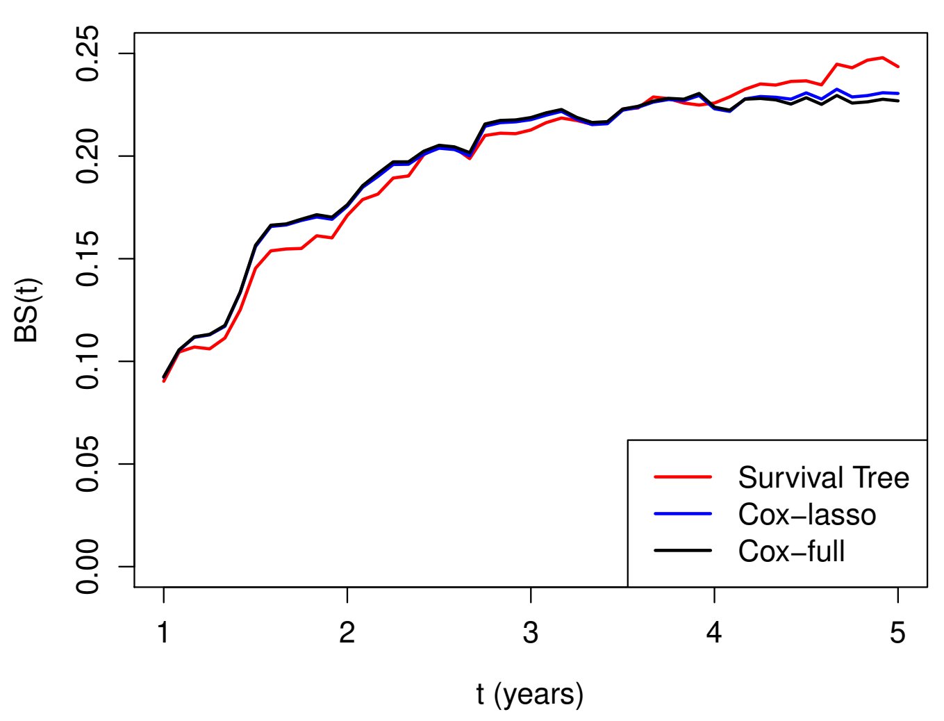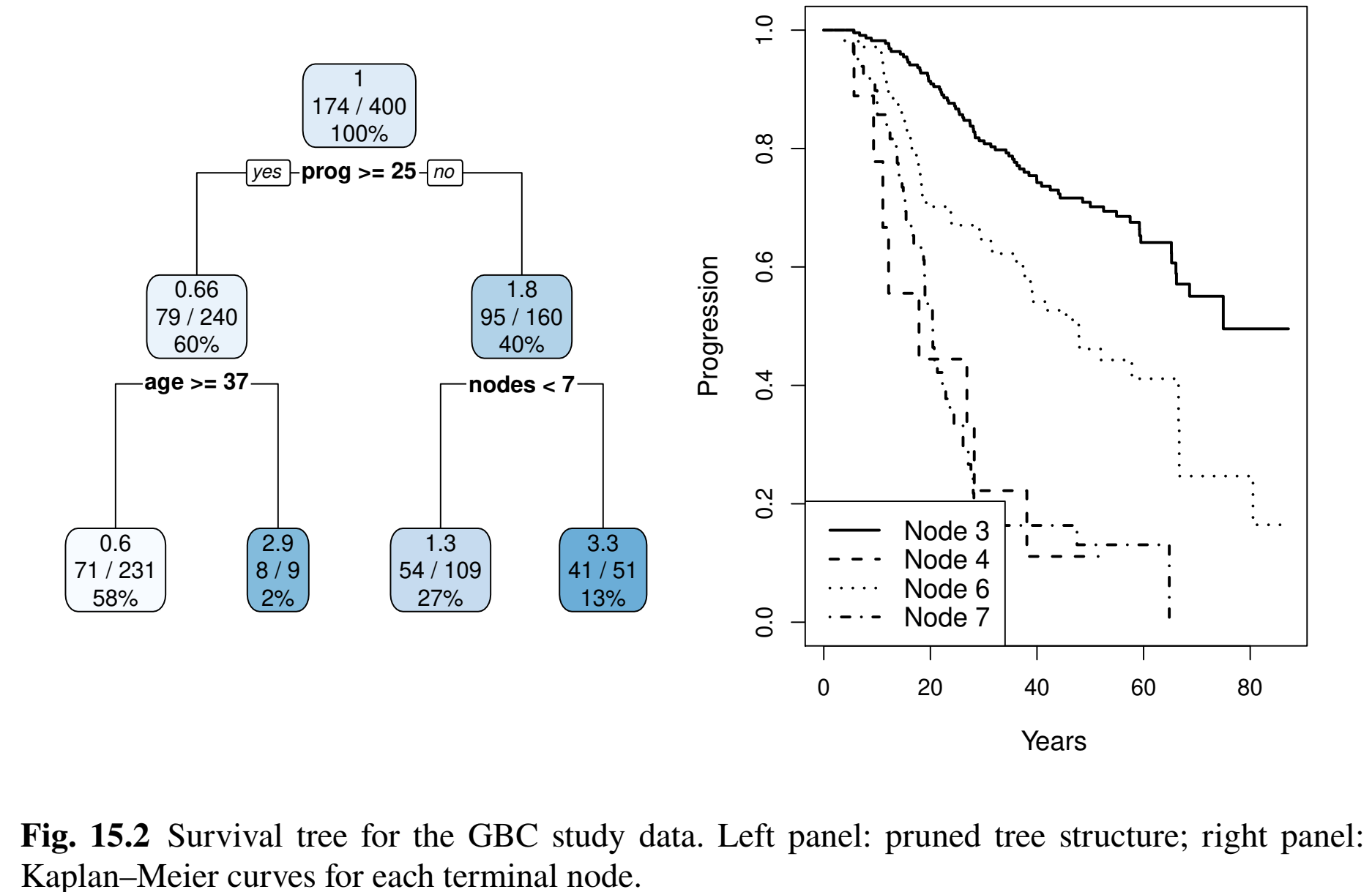 - \(\mathcal T_b\): survival tree grown on \(b\)th bootstrap sample \((b=1, \ldots, B)\) (without pruning)