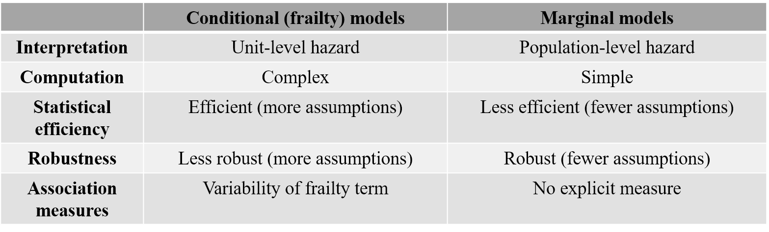 Conditional component-wise model \[\begin{align}\label{eq:multi:ph_cond} \lambda_k(t\mid Z, \xi)&= \xi\exp(\beta_k^\T Z) \eta_{k0}'(t)\\ \pr(T_k>t\mid Z,\xi)&=\exp\left\{-\xi\exp(\beta_k^\T Z) \eta_{k0}(t)\right\} \end{align}\]