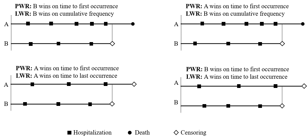 WR::WRrec()ID: unique patient identifier; time: event times; status: event types (1: death; 2: recurrent events; 0: censoring); trt: binary treatment; strata: strata variablenaive = TRUE: calculates naive/FWR as well as LWRWRrec
