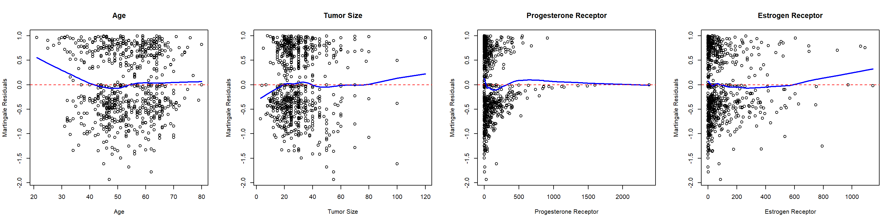 par(mfrow=c(1, 4)) # Set up 1x4 plotting area for 4 covariates# Plot martingale residuals against ageplot(df$age, mart_resid, xlab ="Age", ylab ="Martingale Residuals",main ="Age")# Add smoothed linelines(lowess(df$age, mart_resid), col ="blue", lwd =2)abline(h =0, col ="red", lty =2) # Add horizontal line at 0# Repeat for other covariatesplot(df$size, mart_resid, xlab ="Tumor Size", ylab ="Martingale Residuals",main ="Tumor Size")lines(lowess(df$size, mart_resid), col ="blue", lwd =2)abline(h =0, col ="red", lty =2) # Add horizontal line at 0plot(df$prog, mart_resid, xlab ="Progesterone Receptor", ylab ="Martingale Residuals",main ="Progesterone Receptor")lines(lowess(df$prog, mart_resid), col ="blue", lwd =2)abline(h =0, col ="red", lty =2) # Add horizontal line at 0plot(df$estrg, mart_resid, xlab ="Estrogen Receptor", ylab ="Martingale Residuals",main ="Estrogen Receptor")lines(lowess(df$estrg, mart_resid), col ="blue", lwd =2)abline(h =0, col ="red", lty =2) # Add horizontal line at 0