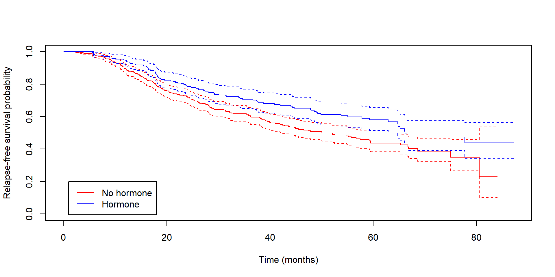 Compare survival curves (e.g., hormone therapy vs. no hormone therapy)
